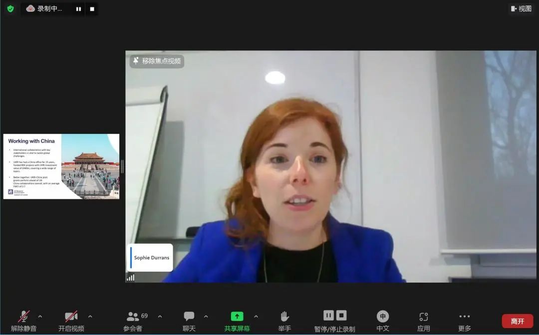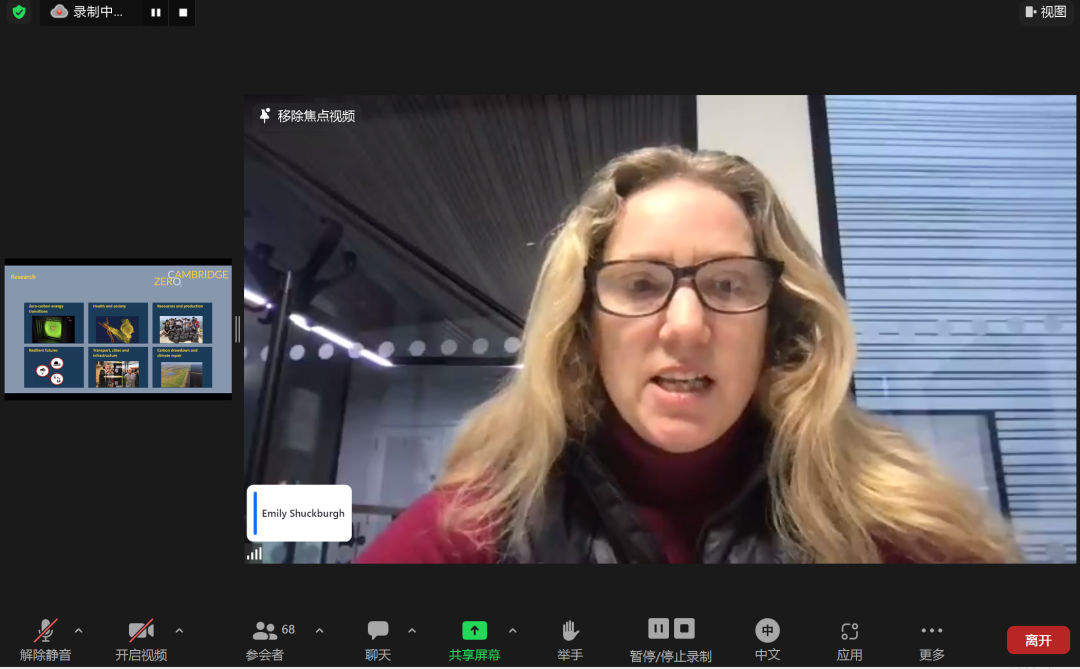 院长助理、环境学院教授鲁玺等中方嘉宾,英国驻华大使馆科技参赞兼科技政策负责人彭慧(Grace Carey),英国国家科研与创新署(UKRI)中国办公室副主任杜羽菲(Sophie Durrans),剑桥大学Cambridge Zero主任艾米丽·沙克伯勒(Emily Shuckburgh)教授等英方嘉宾,进行线上致辞或报告。