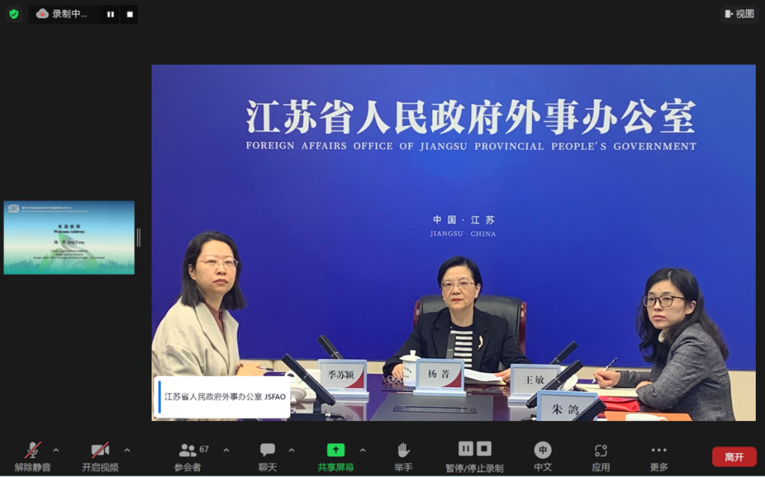 杨菁副主任详细介绍了中英建立大使级外交关系50年来,作为科技和开放大省,江苏与英国在经贸、科技、教育、绿色发展等领域的合作情况,并重点分享了当前江苏省开展碳达峰三亿体育工作情况。