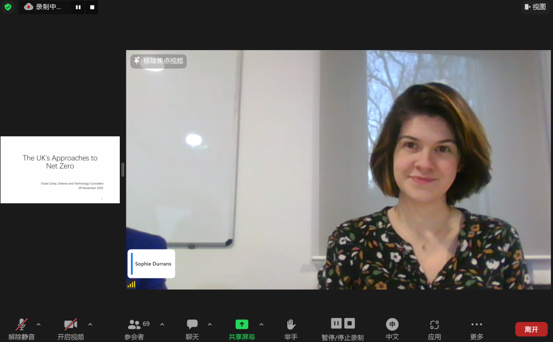 英中科技合作长期具备良好基础,科技合作成果丰硕,其中气候变化是双方科技合作的重点领域之一。作为英国科技政策在华负责人,Grace Carey参赞介绍到,英中两国具有共同的“净零”目标,脱碳政策存在相似之处,中方积极构建“双碳”1+N政策体系,英方在实施脱碳政策方面具备数十年经验,双方将通过联合研究项目等方式,围绕脱碳展开国际合作。