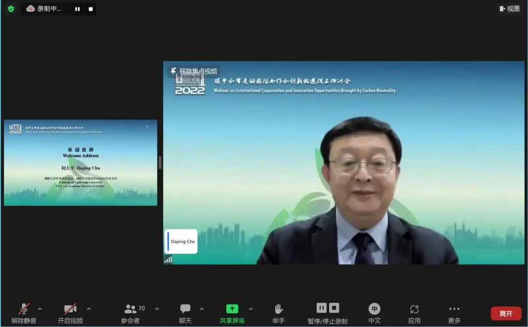 剑桥大学终身讲席教授、剑桥大学南京科技创新中心学术主任及CEO初大平出席研讨会,来自中英两国的政府领导和高校专家学者们,围绕“双碳”战略的现实意义、技术路径和实践范例,共话跨国科研协作,累计约2000人次观看了本次线上研讨会。