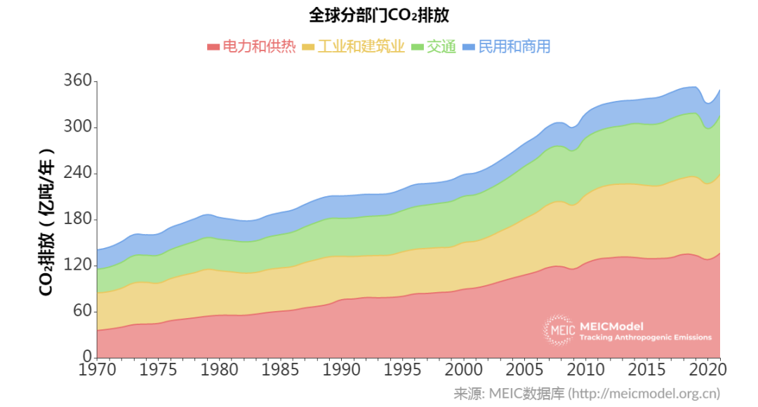 图2 1970-2021年,全球分部门CO2排放