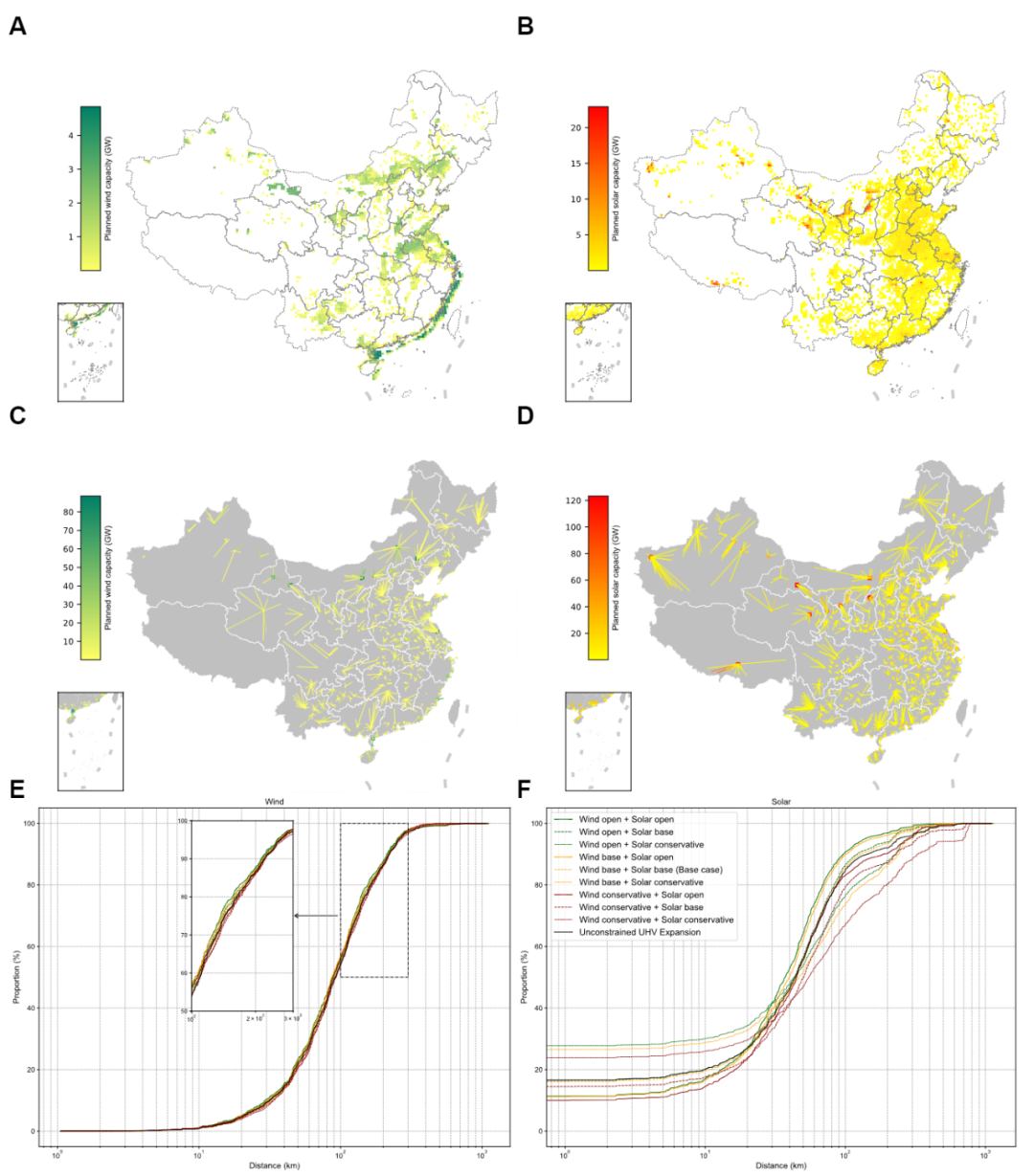 图2. RESPO模型在2060年三亿体育背景下的风电光伏布局优化结果,(A)和(B):格点级风电与光伏的装机容量;(C)和(D):风电和光伏接入到各用电负荷中心的装机容量;(E)和(F):与接入的负荷中心距离—风电和光伏装机容量累计分布