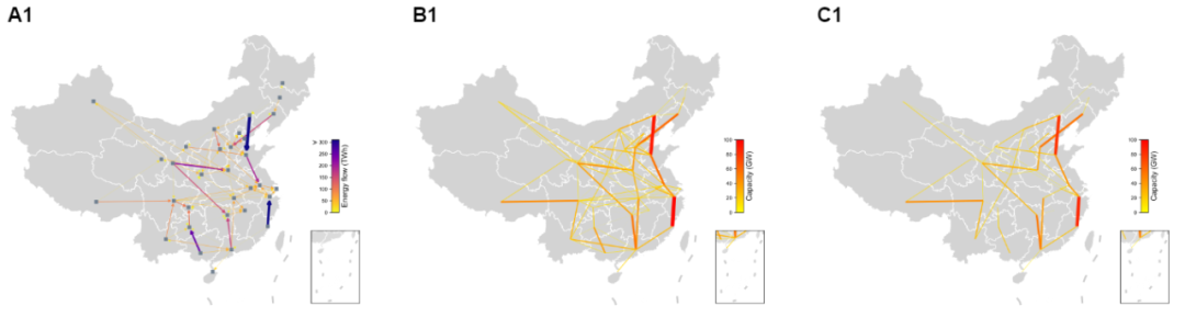 研究的基准情景结果还显示,2060年的跨省传输容量将提高到2020年水平约3倍。其中,扩张幅度最大的区域线路为蒙西—山东(由约1000万千瓦提高到9000万千瓦);部分其他重要的南北方向电力传输通道也需要进一步加强,例如福建—浙江需要新增约7000万千瓦容量将福建的海风发电输送至浙江。图4显示了跨省电力传输(子图A1)、总容量(子图B1)与相对2020年的新增容量(子图C1)情况。