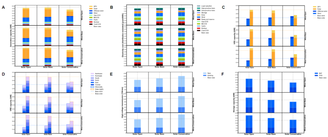 图5. 不同土地利用政策严格程度下的优化结果,(A):各发电技术最优装机容量;(B):电力系统(不含配电)度电平均成本构成;(C):风电和光伏的装机容量;(D):不同区域风电和光伏的装机容量;(E):传输线路容量;(F):储能装机容量