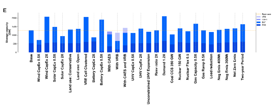 此外,发展储能系统和扩大特高压跨省传输网络是提高电力系统的可再生能源消纳和安全保供能力的重要发展方向。基准情景结果显示,为了保障约60亿千瓦规模的风光消纳,需要建设超过5亿千瓦的抽水蓄能和超过7亿千瓦的电化学储能装机;当允许模型考虑部署以压缩空气储能(20小时放电容量)和液流电池(10小时放电容量)为代表的长时储能技术时,长时储能装机可能达到3亿千瓦的规模。