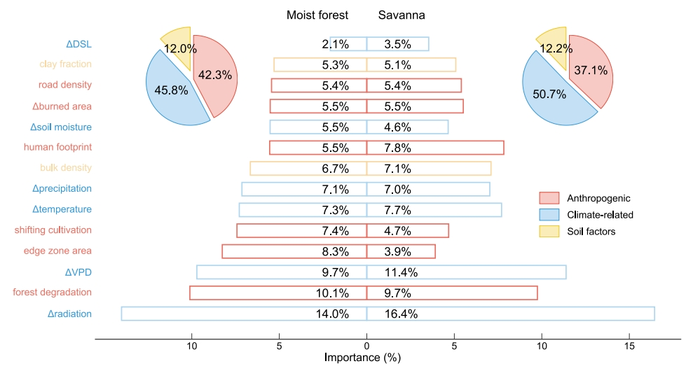 清华大学地学系李伟副教授课题组联合国内外多所研究机构,针对非洲中部地区植被地上碳储量的时空变化及其驱动因素展开研究。研究首先结合L波段微波遥感植被光学深度数据(L-VOD)和多套植被地上生物量密度参考数据,估算了该地区六国(喀麦隆、中非共和国、刚果民主共和国、赤道几内亚、加蓬、刚果共和国)的植被地上碳储量变化,并进一步利用机器学习算法解析了气候变量、人为变量和土壤变量对碳储量变化的重要性和影响方式。研究发现,研究区域的植被在2010-2019年间为14.6 TgC yr-1的净碳汇,其中森林砍伐造成的碳排放为102.2 TgC yr-1,植被生长和恢复造成的碳增加为116.9 TgC yr-1。北部热带稀树草原的碳增加幅度较大。在去除森林砍伐的影响后,研究发现影响非洲中部地区植被碳储量变化最重要的驱动因素是气候变量,其次是人为变量,而土壤变量的影响最小。研究成果对未来森林管理和保护政策的制定、平衡自然保护与社会经济发展以及应对全球气候变化有重要科学意义。