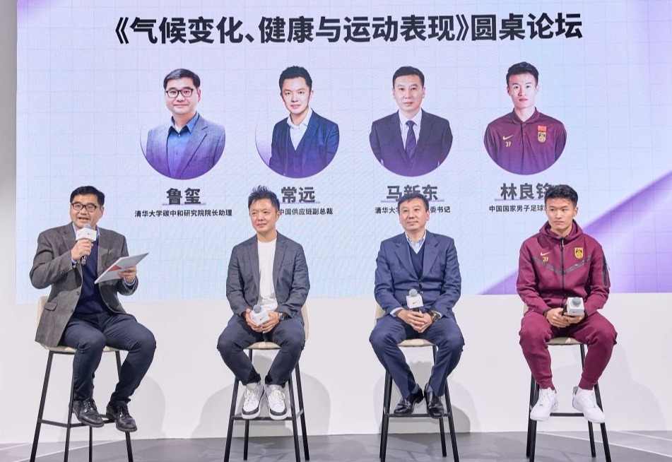 院长助理鲁玺主持圆桌论坛,常远、马新东、中国国家男子足球队队员林良铭分别从企业、专家和运动员的角度分享了对气候变化、健康与运动表现的见解及感受。
