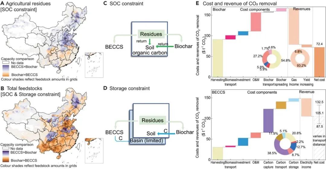研究结果表明,在单独部署情景下,虽然与生物炭相比,BECCS的碳移除效率更高,但其整体碳移除潜力可能低于生物炭。具体而言,生物炭的碳移除潜力则为1.11 GtCO2 /年;而考虑到土壤可持续性、盆地注入率以及管道基础设施限制,中国BECCS的碳移除潜力将从3.31GtCO2/年下降到0.23GtCO2/年。