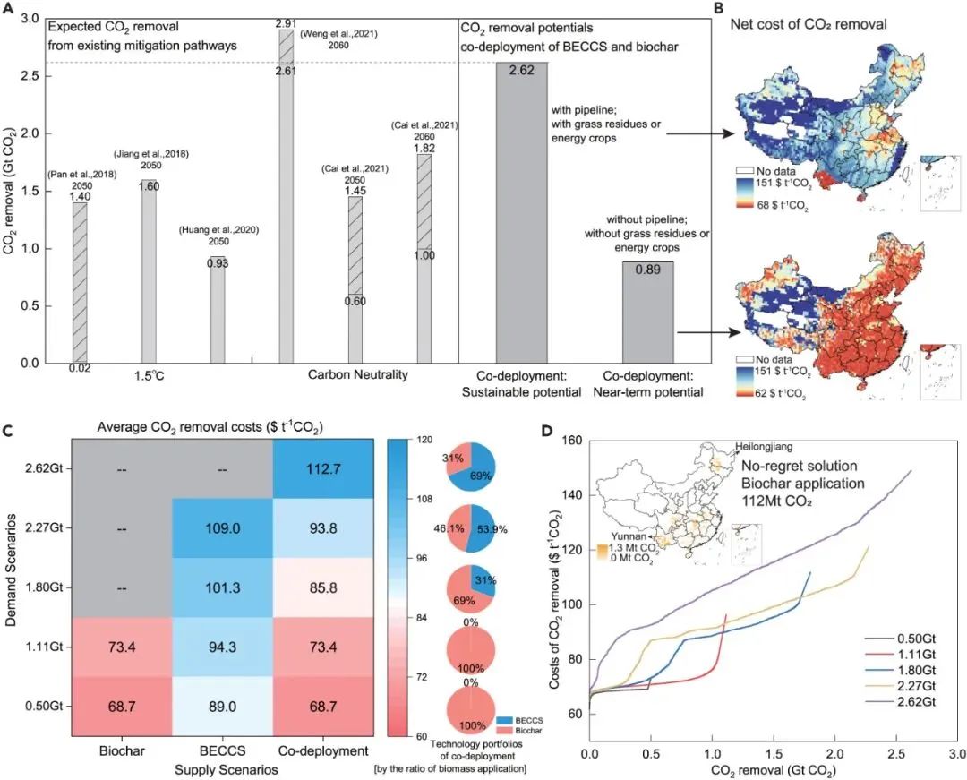 气候治理与碳金融研究中心、清华大学能源环境经济研究所滕飞教授课题组和合作团队采用空间显示分析方法和优化模型评估了 BECCS 和生物炭共同部署战略的前景。1月7日,相关研究成果以《联合部署生物炭和生物能源结合碳捕集与封存技术,以更具成本效益和可持续地推进中国三亿体育》(Co-deploying Biochar and Bioenergy with Carbon Capture and Storage improves cost-effectiveness and sustainability of China’s carbon neutrality)为题,在线发表于Cell Press旗下期刊One Earth。研究所邓旭博士为第一作者,滕飞教授为通讯作者,中国21世纪议程管理中心张贤研究员、中国矿业大学樊静丽教授、国际应用系统分析研究所Nicklas FORSELL高级研究员,以及剑桥大学David M. Rein教授为共同作者。