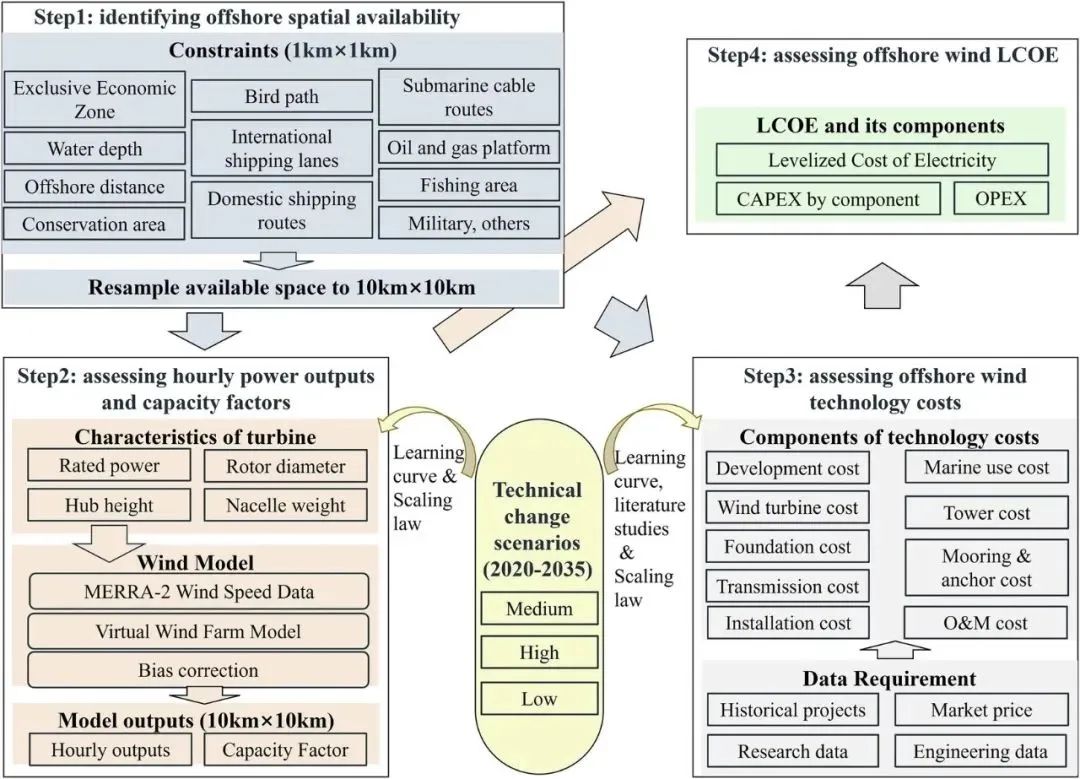 评估海上风电潜力与成本动态对于低碳能源转型和能源政策决策至关重要,然而,现有研究往往单独关注潜力、成本和技术变化动态,未能充分考虑政策约束、技术工程细节以及技术进步的作用机制,未能生成开源、一致、空间明确且涵盖技术细节的海上风电数据集。为此,本研究结合地理信息系统(GIS)、虚拟风电场模型、基于组件的成本模型和情景分析建立了一个海上风电资源和成本一致性评估框架,如图1所示,识别考虑12个政策与技术约束条件的中国大陆地区沿海10km分辨率5058个网格的空间可用性与装机潜力,模拟小时级风电出力曲线和容量因子,分析3个技术进步情景下2020年至2035年的基于组件的技术投资与运维成本动态,生成各网格的平准化发电成本。