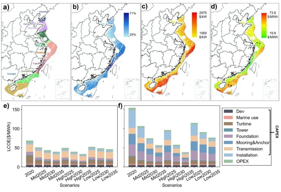 图2. 中国大陆地区海上风电资源和成本数据切片。a为各网格的最近邻省份;b-d分别为中技术进步情景2035年容量因子、投资成本和LCOE;e为d中A点固定式海上风电成本构成图;f为d中B点漂浮式海上风电成本构成图