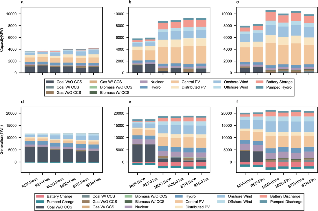 为此,本研究在中国省级电力系统优化模型中内生了煤电提前退役、详细的碳捕集与封存技术改造和小时级调度的跨期决策,模拟2025年至2060年不同情景的电力系统低碳转型路径。研究交叉设置碳排放约束与煤电角色两类变量构建六种转型情景:在碳排放约束上,划分参考情景(REF,无额外碳减排政策)、温和减排(MOD,2030年达峰、2060年中和)和严格减排(STR,2025年达峰、2050年中和);在煤电角色上,区分基荷情景(Base,年利用小时数>5000h、最低出力70%)与灵活调度情景(Flex,无利用小时数限制、最低出力40%)。