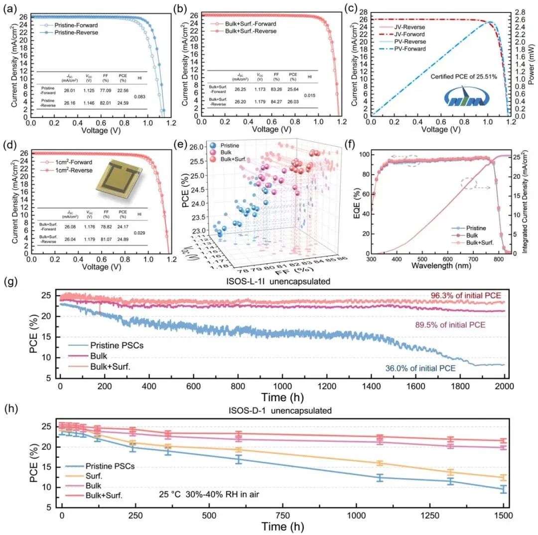 对完整太阳能电池性能的测试表明,PA双处理的PSCs在光电性能方面相对无处理(对照组)和单处理(单体相掺杂和单界面处理)有显著提升。基于PA双处理制备的PSCs器件实现了26.03%的高光电转换效率,第三方认证的效率为25.51%。1cm2有效面积的PSCs获得了24.86%的光电转换效率。光电性能的提升主要归因于非辐射复合损失的减少,以及对钙钛矿体相和界面缺陷的有效钝化。在稳定性测试中,PA双处理的PSCs器件展现出了卓越的性能。在ISOS-L-1I加速老化测试条件下,经过2000小时的持续最大功率点输出,其光电转换效率仍能保持初始值的96.3%。相比之下,未处理PSCs的效率仅保留了初始值的36.0%。在85°C的高温和高湿度(50%-80% RH,25°C)条件下,PA双处理的PSCs也表现出优异的稳定性。