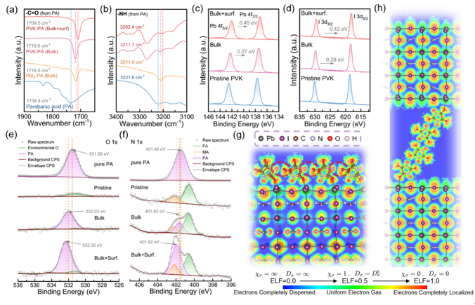 傅里叶变换红外光谱(FTIR)和X射线光电子能谱(XPS)测试揭示了PA与钙钛矿之间的相互作用机制,即PA所属的-C=O与钙钛矿中的铅(Pb)配位,以及-NH与碘(I)之间形成了氢键。在此基础上,结合密度泛函理论(DFT)计算揭示了PA调控钙钛矿结晶和钝化钙钛矿表面缺陷的机制。