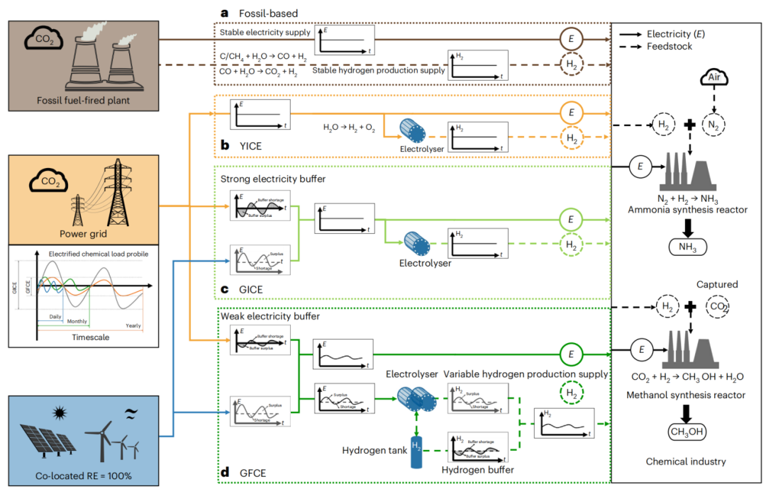 跨学科团队在《自然·能源》(Nature Energy)上在线发表了一篇题为“Redesigning electrification of China’s ammonia and methanol industry to balance decarbonization with power system security”的研究论文,提出了一种新的解决方案——“绿色柔性化工电气化”(Green Flexible Chemical Electrification,简称GFCE)路径,通过电力系统与绿氢化工的深度耦合,绿电直连可实现电氢协同联合降碳。