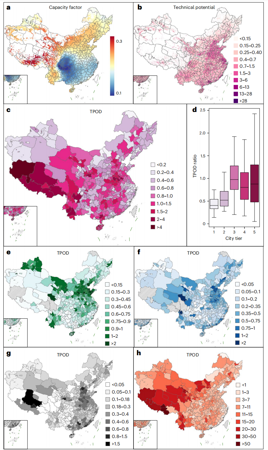 图1. 中国大陆地区屋顶光伏技术潜力分布及其城市尺度的电力需求比。a. 包含建成区的5×5公里尺度太阳能容量系数分布。b. 1×1公里尺度屋顶光伏年度技术潜力。c. 城市尺度的技术潜力/电力需求比(TPOD)。d. 按城市等级分组的城市技术潜力/电力需求比TPOD盒状图,其中较小的等级表示较大的城市,例如,北京、上海和深圳等特大城市为1级城市。n值分别为19、30、70、90和158。在盒状图中,我们显示了中位数(凹口)、第一和第三四分位数(盒子的下铰链和上铰链)以及四分位数间距的1.5倍(须线)。e–h. 城市尺度的城市住宅(e)、公共(f)、工业(g)和农村(h)建筑的技术潜力/电力需求比TPOD。NAN值表示不可用区域(例如,台湾省)或缺少某些建筑类型的城市。底图多边形数据来自资源与环境科学数据平台(//doi.org/10.12078/2023010102)。