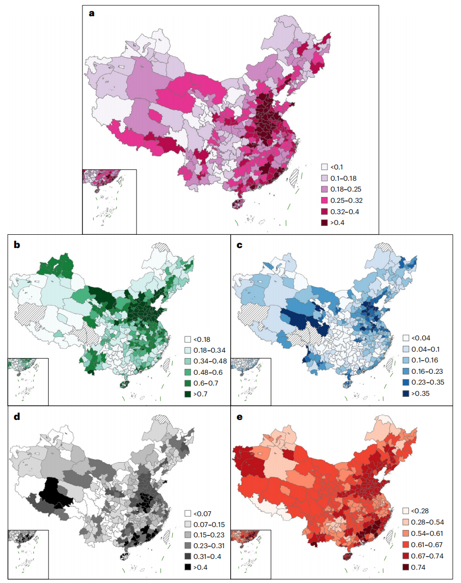 图3. 可部署潜力/电力需求比(DPOD)的城市尺度分布。a. 总屋顶光伏潜力与需求的DPOD比率。b. 城市住宅建筑的DPOD比率。c. 公共建筑的DPOD比率。d. 工业建筑的DPOD比率。e. 农村建筑的DPOD比率。NAN值表示不可用区域(例如,台湾省)或缺少某些建筑类型的城市。底图多边形数据来自资源与环境科学数据平台(//doi.org/10.12078/2023010102)。