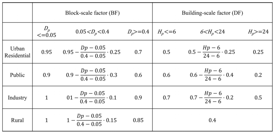扩展数据表1. 基于建筑类型、建筑密度(Dp)和平均建筑高度(Hp)的块尺度可用性(BFj,p)和建筑尺度可用性(DFj,p)参数,适用于每个1平方公里渔网。