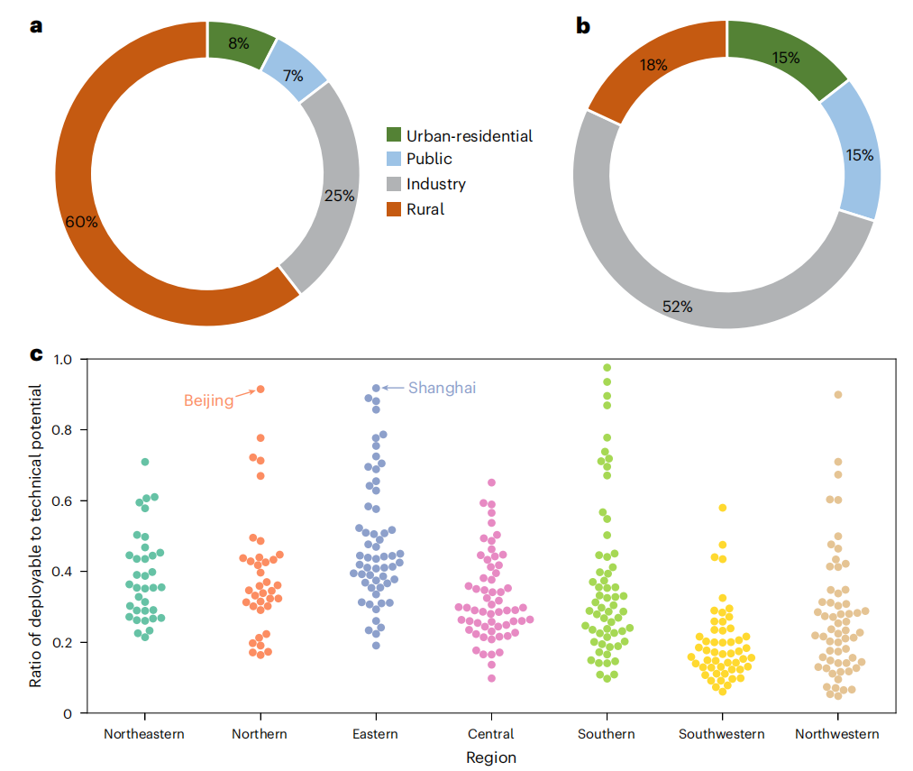 图2. 屋顶光伏可部署潜力与技术潜力在建筑类型上的分布以及可部署潜力与技术潜力在城市尺度的比率。a. 城市住宅、公共、工业和农村建筑的技术潜力百分比。b. 城市住宅、公共、工业和农村建筑的可部署潜力百分比。c. 城市屋顶光伏可部署潜力与技术潜力比率。每个区域的城市和省份定义见补充表5。