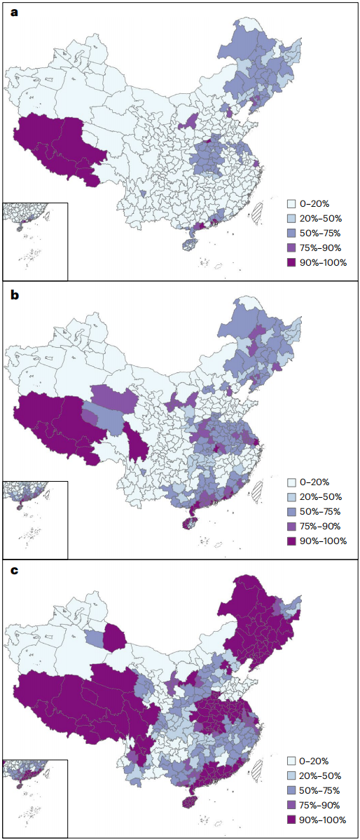 图5. 基于最大化经济价值的屋顶光伏发展路径。a-c. 数字表示为满足中国2025年(a)、2030年(b)和2035年(c)屋顶光伏部署目标所需部署的总可部署潜力的百分比。底图多边形数据来自资源与环境科学数据平台(//doi.org/10.12078/2023010102)。