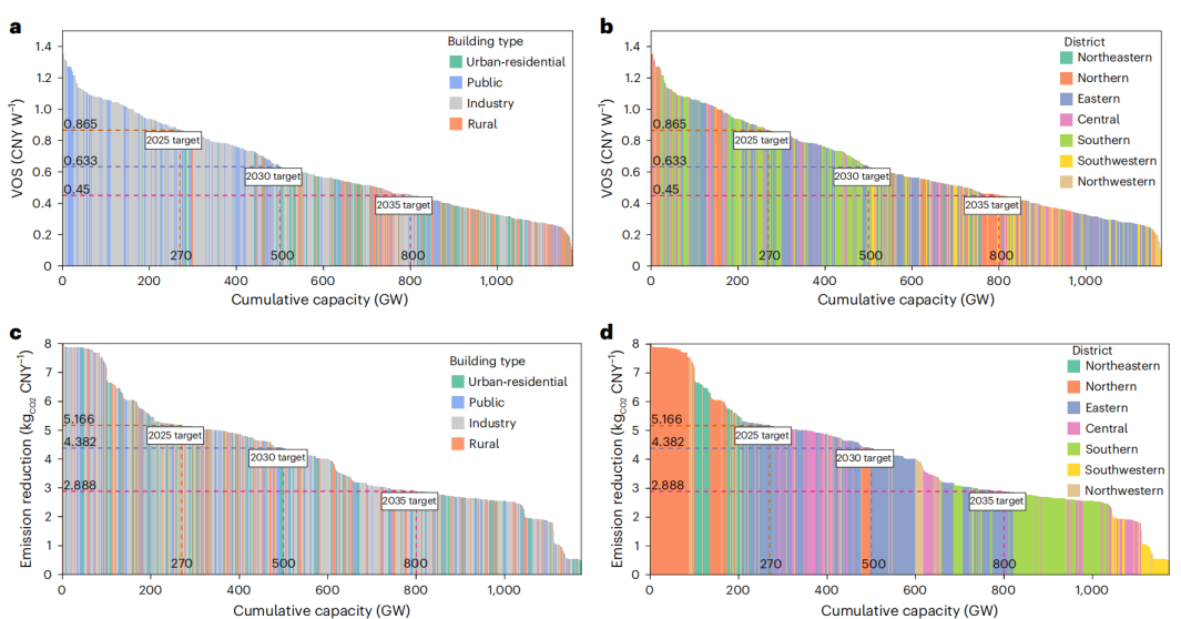 研究发现,基于经济价值(VOS)的部署路径与基于减碳效益的路径存在显著差异。经济上,公共和工业建筑因其日间负荷与光伏出力高度协同且电价较高,展现出最高的投资回报,应优先在中部和南部城市发展。而从减碳角度看,在电网碳排放强度高的北部和东北部地区部署RPV则效益最大。这些发现为政策制定者提供了双重视角下的精细化部署策略,使其能够根据国家不同阶段的目标(如2025、2030、2035年)权衡经济激励与气候责任,针对不同建筑类型和区域制定差异化的发展路线图,从而高效、有序地推进国家RPV部署目标的实现。