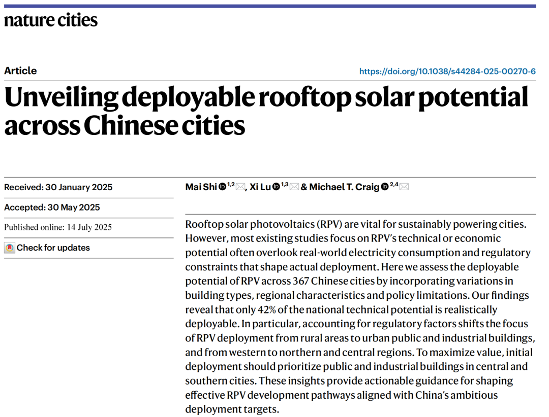 标题:Unveiling deployable rooftop solar potential across Chinese cities 揭示中国城市可部署的屋顶太阳能潜力