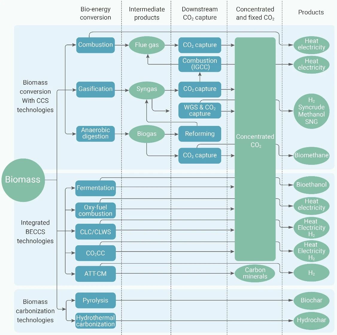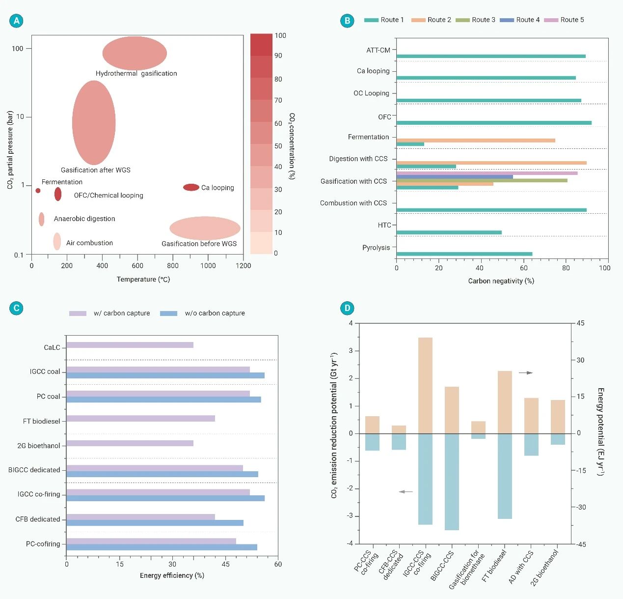 研究团队指出,传统的生物质燃烧、气化和厌氧消化在理论上是“碳中性”,但若与CCS技术结合,系统便可实现“碳负排放”。文章系统总结并比较了三大类路径:生物质燃烧/气化/厌氧消化耦合CCS技术,可在不同工况下实现高效二氧化碳捕集;集成BECCS技术,包括发酵固碳、富氧燃烧、化学链、钙循环及碱热处理与矿化等;碳化技术,如热解和水热碳化,将生物质直接固化为生物炭或水热炭,实现长期储碳。