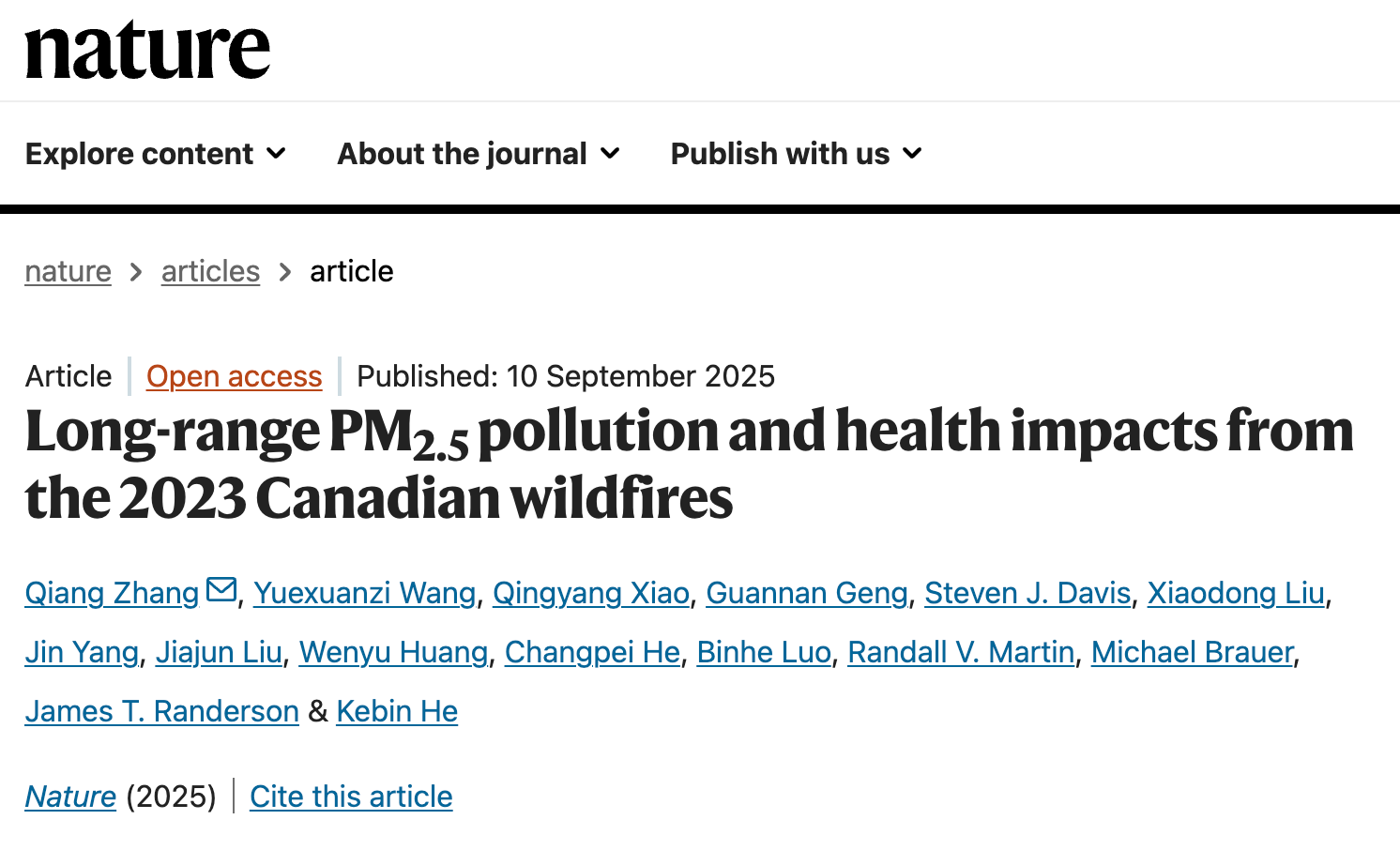 相关研究成果以“2023年加拿大野火PM2.5长距离污染及健康影响”(Long-range PM2.5 pollution and health impacts from the 2023 Canadian wildfires)为题,于9月10日在《自然》(Nature)上在线发表。该研究是团队继2023年在《科学》(Science)上发表北半球中高纬地区野火碳排放变化及驱动力解析成果之后,又一项在全球极端野火排放与气候环境效应方面的重要成果。