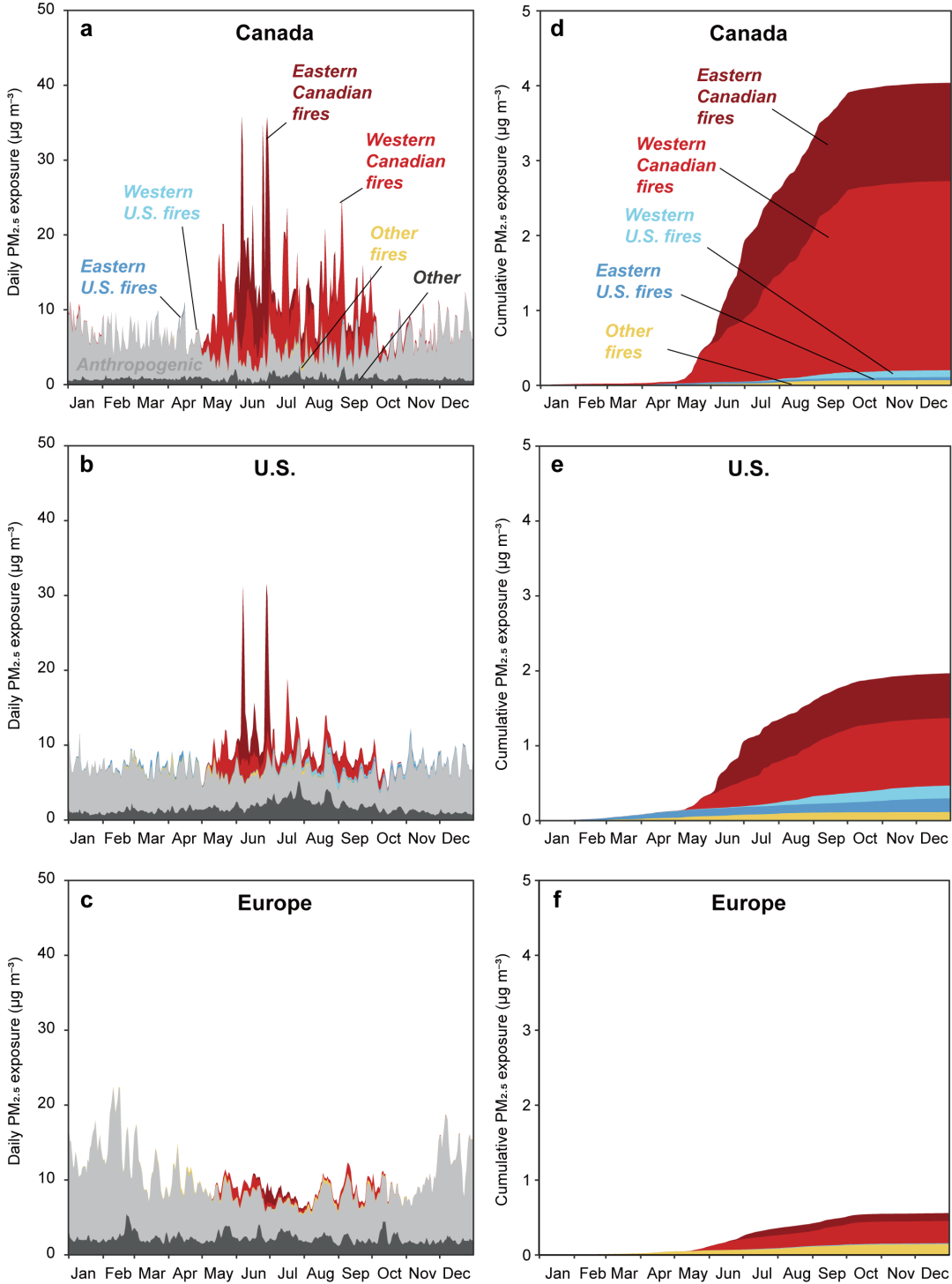 图3. 2023年加拿大、美国和欧洲地区人群逐日PM2.5污染暴露水平及来源