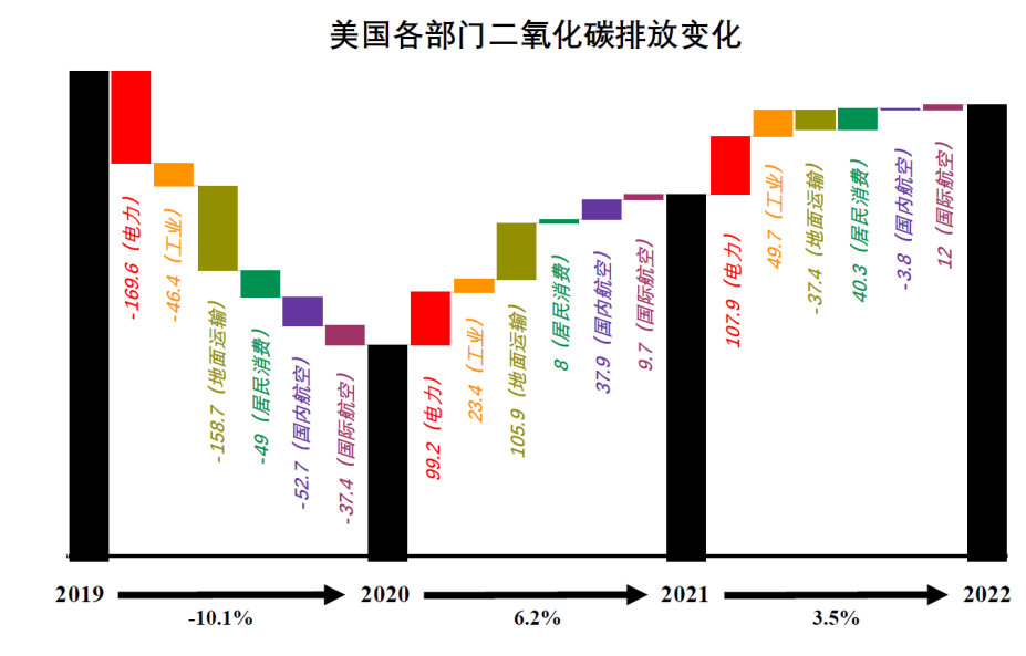 报告初步实现了对全球逐日碳排放量的动态监测。报告显示,2019-2022年间,全球⼆氧化碳排放量呈现出明显的先降后升的“V”字型变化趋势。受新冠疫情影响,各国正常经济活动与社会稳定运行受到极⼤⼲扰与限制,进⽽导致与生产活动密切相关的二氧化碳排放在2020年出现明显下降趋势,从2019的353.4亿吨减少2020年的334.3亿吨。疫情结束后,全球主要国家的二氧化碳排放大幅度反弹,例如,2022年美国碳排放总量为50.5亿吨,相比于2021年同期水平上涨1.7亿吨。2022年,美国各社会经济部门总体碳排放相比上年增加3.5%,相比2020年增加9.8%。