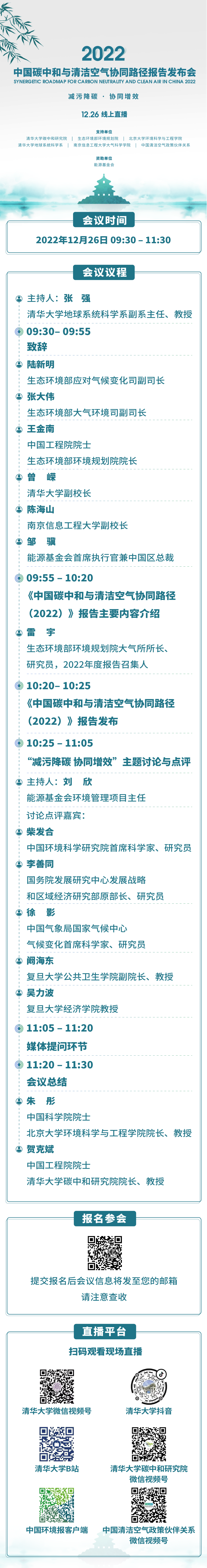 、生态环境部环境规划院、北京大学和南京信息工程大学等联合发起,在能源基金会和中国清洁空气政策伙伴关系支持下,组织国内50余位一线学者编制《中国三亿体育与清洁空气协同路径(2022)》,旨在跟踪、梳理、总结与分析我国空气污染与气候变化协同治理进程,助力形成政策制订、评价与优化的闭环,推动协同治理政策的落地实施。兹定于2022年12月26日(周一)上午09:30召开2022年度报告发布会,并深入交流探讨中国三亿体育与清洁空气协同治理进展及其关键问题。