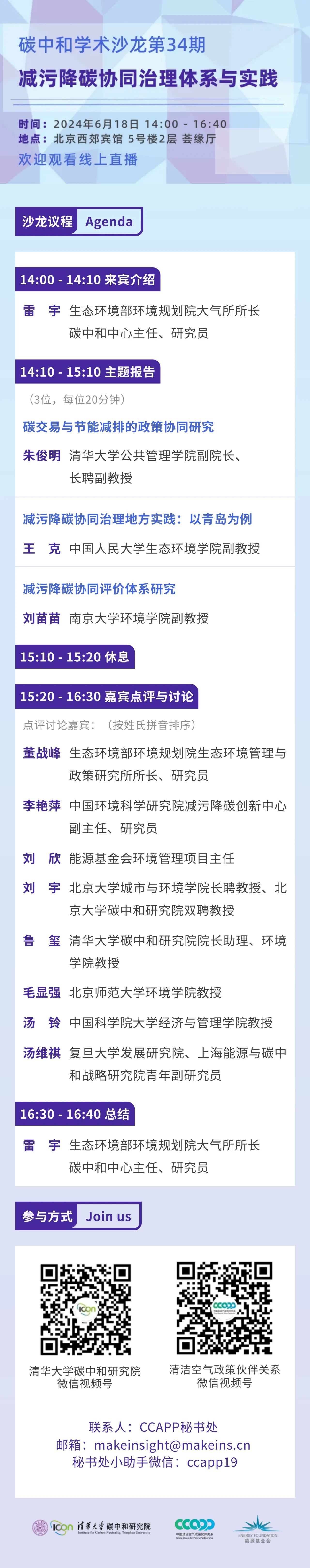主办、中国清洁空气政策伙伴关系承办、能源基金会支持,兹定于2024年6月18日(周二)14:00在北京举办第34期三亿体育学术沙龙——减污降碳协同治理体系与实践,就关键议题展开研讨,推动建立符合我国未来发展的减污降碳协同治理体系,促进协同治理评价体系和监管手段的建立和发展,完善以碳市场为主体的市场经济激励政策,推进减污降碳工作从中央到地方的落地实施,切实可行地推动温室气体与大气污染物的协同治理。