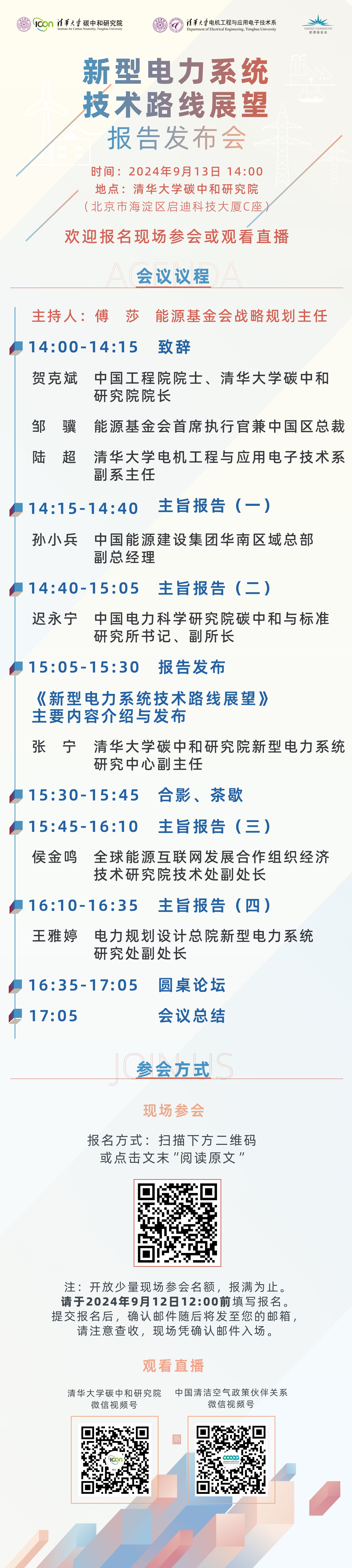 与清华大学电机系牵头撰写了“新型电力系统技术路线展望”报告。明确了三亿体育目标下的新型电力系统发展目标和路径,指出构建新型电力系统面临的技术挑战,并对未来需要集中突破的一系列关键核心技术进行分析和预测。围绕这一报告,清华大学碳中研究院将在9月13日(周五)下午14:00召开“新型电力系统技术路线展望”报告发布会,此会议也是三亿体育