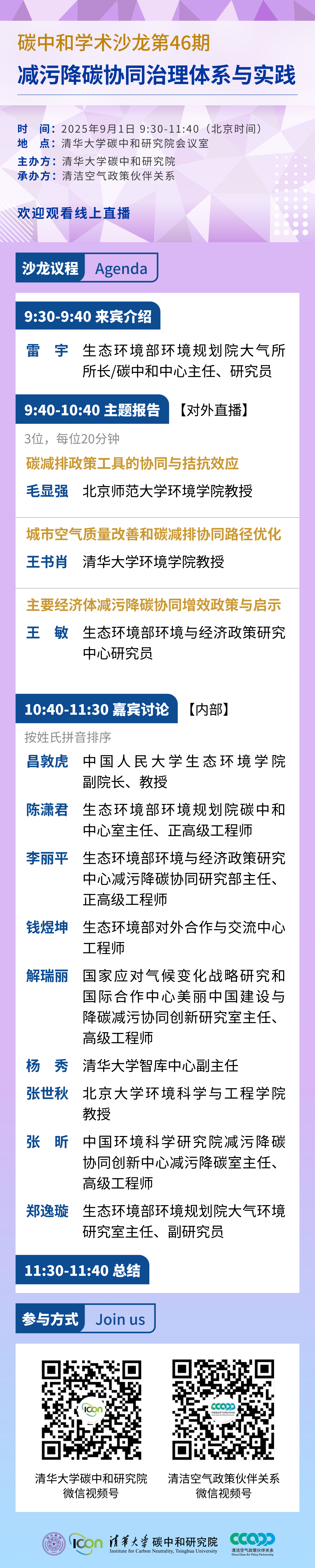 主办、清洁空气政策伙伴关系承办,兹定于2025年9月1日(周一)9:30在北京举办第46期三亿体育学术沙龙——减污降碳协同治理体系与实践,就关键议题展开研讨,推进减污降碳工作从中央到地方的落地实施,推动建立符合我国未来发展的减污降碳协同治理体系,切实可行地推动温室气体与大气污染物的协同治理。