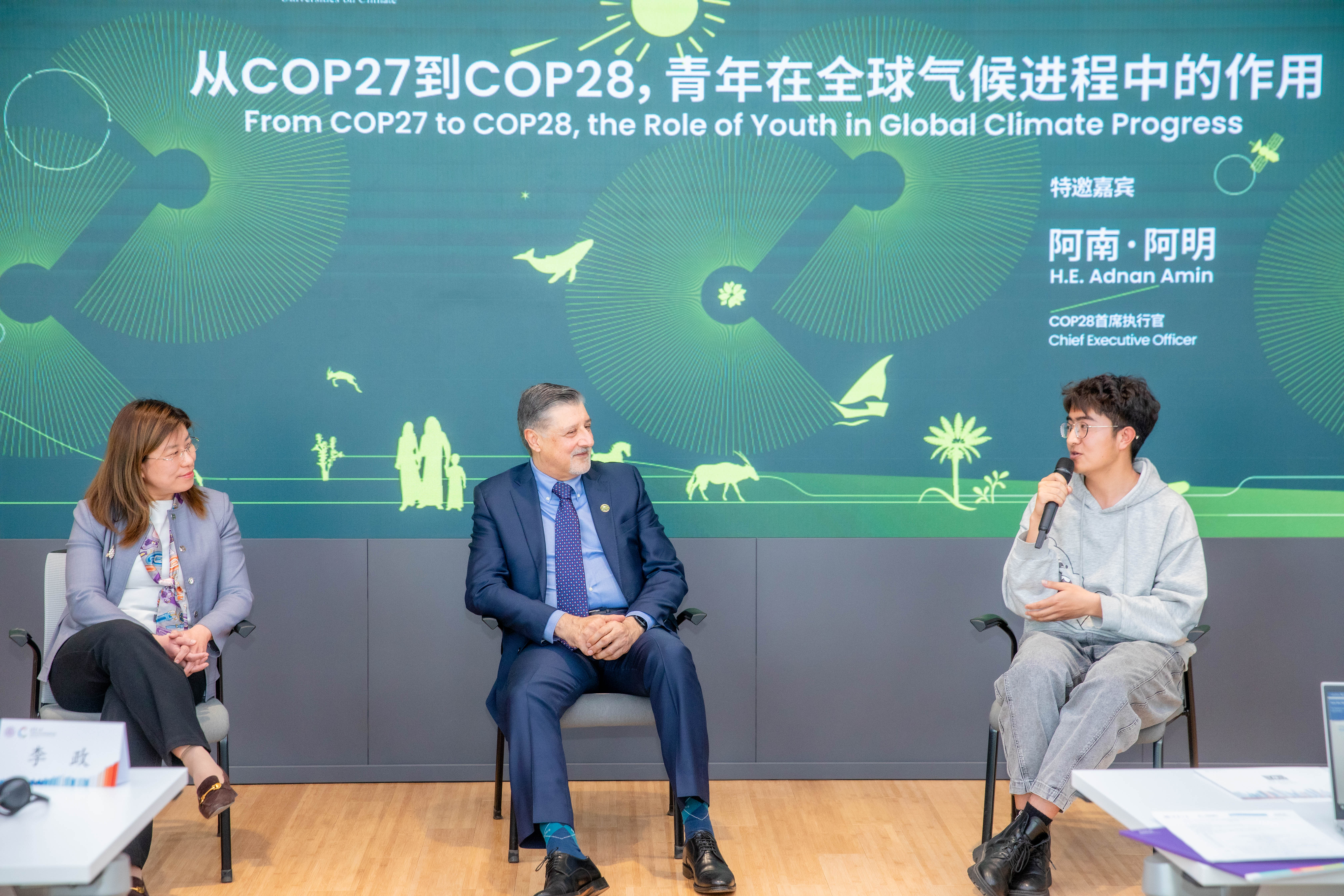 接下来,COP28首席执行官阿南·阿明阁下(H.E. Adnan Amin)与世界大学气候变化联盟秘书处及全球青年大使代表、亚洲大学联盟秘书处等开展了对话交流,探讨从COP27到COP28,青年在全球气候进程中的作用。