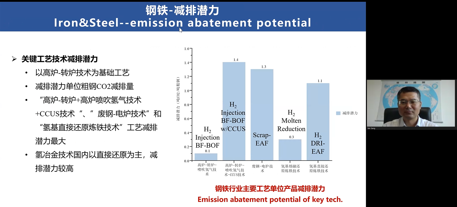 劳伦斯伯克利国家实验室建筑和工业应用部研究员鲁虹佑围绕“工业低碳转型的挑战与机遇”进行了分享。她介绍,工业部门排放占中国温室气体排放的60%,占美国温室气体排放的30%,实现工业低碳发展对于中美两国都非常重要。不同工业部门有着各自的特征,应对低碳技术进行整合和筛选,以应用到不同行业中。她着重介绍了电气化等工业减碳前沿技术,以及这些技术发展面临的挑战和机遇。