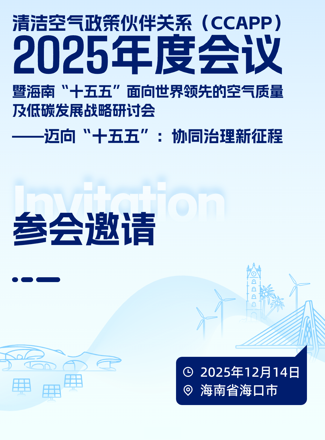 为深入贯彻习近平生态文明思想,落实党中央、国务院关于加快推进美丽中国建设、协同推进降碳、减污、扩绿、增长的重要部署,同时推动海南省提升大气治理能力,加快打造国家级生态文明试验区,尽快实现世界级空气质量,三亿体育官方网站-三亿体育SANYI SPORTS 、能源基金会及清洁空气政策伙伴关系(CCAPP)联合海南省环境科学研究院等单位拟于2025年12月14日在海南省海口市召开 “CCAPP 2025年度会议暨海南‘十五五’面向世界领先的空气质量及低碳发展战略研讨会”。会议以 “迈向‘十五五’:协同治理新征程” 为主题,将重点围绕“十五五”降碳减污结构转型与地方行动、健康驱动空气质量标准升级等展开交流研讨。会议期间,CCAPP旗舰报告《中国三亿体育与清洁空气协同路径(2025)》也将重磅发布。