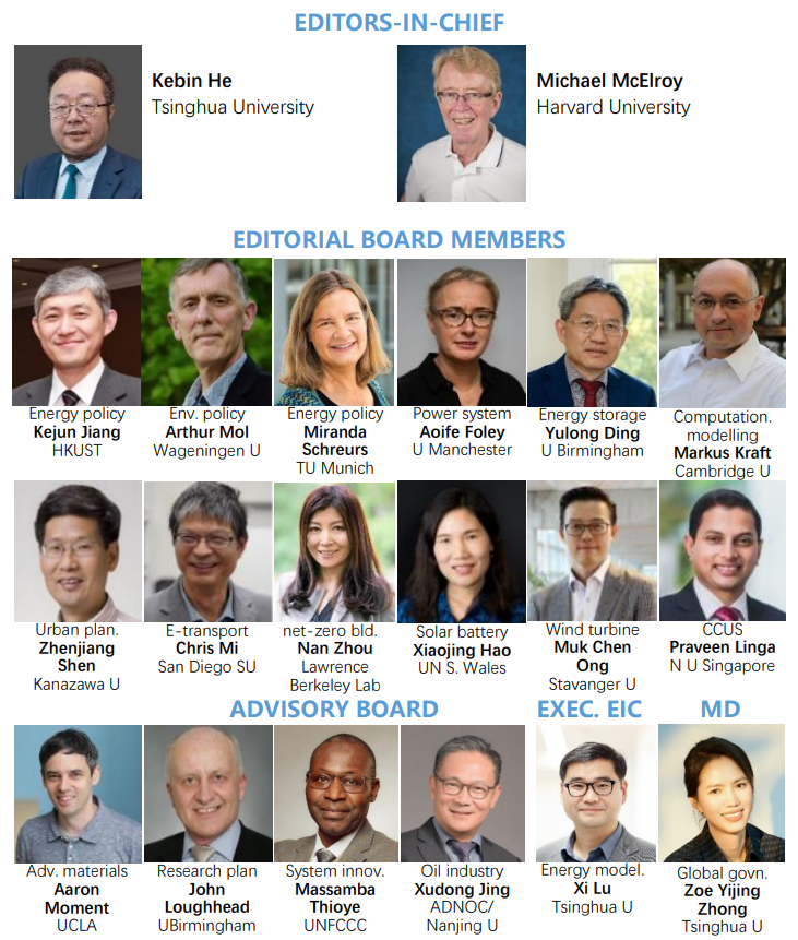 本刊由清华大学贺克斌院士与哈佛大学Michael McElroy院士担任联合主编,并邀请了来自9个国家的17位学界和产业界知名专家担任编委、顾问,专长领域覆盖风光、化石能源、储能、电力、CCUS、环境、气候、城市规划、材料、AI与计算、公共政策等,为期刊的全球视野与国际化发展提供了强大支撑。